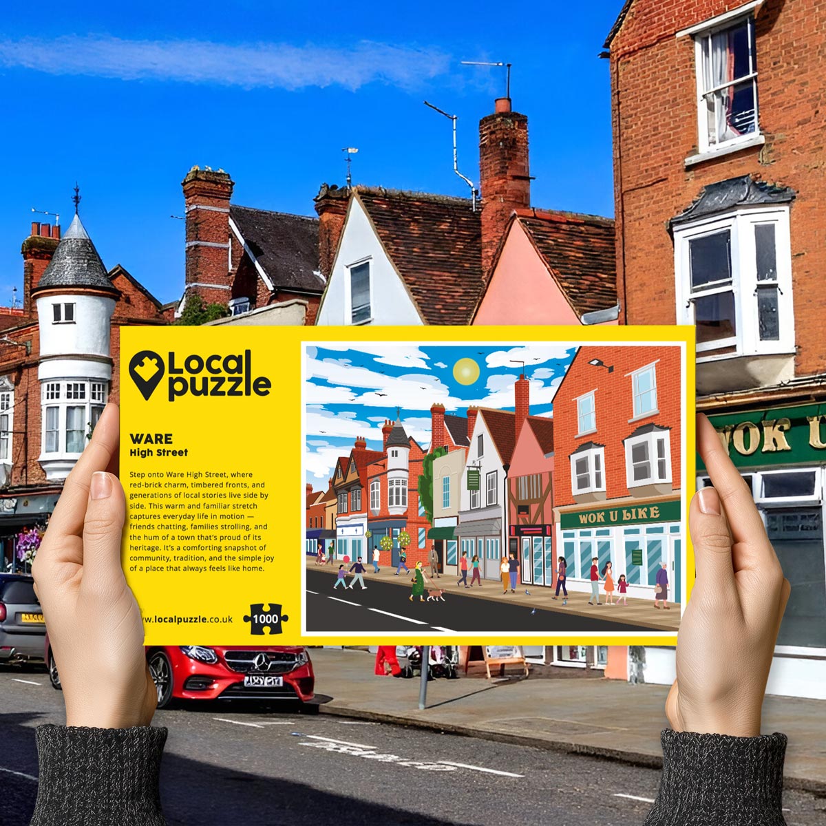 Step into the vibrant heart of East Hertfordshire with our “Ware High Street” Jigsaw Puzzle, a warm tribute to one of the county’s most characterful and cherished streets. This beautifully illustrated scene captures Ware’s mix of Tudor timber frames, red-brick shopfronts, and independent businesses — all brought to life beneath a bright sky and the gentle rhythm of local life. It’s a nostalgic, feel-good celebration of a town where history, community, and everyday moments come together.